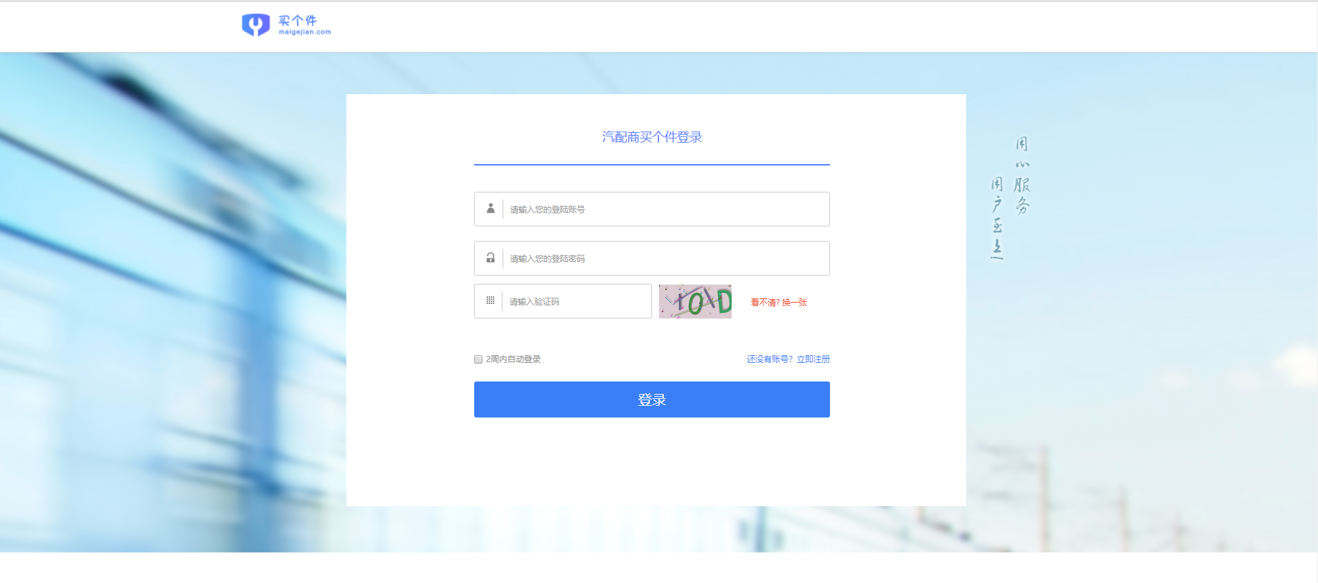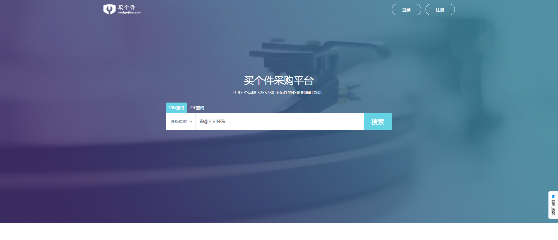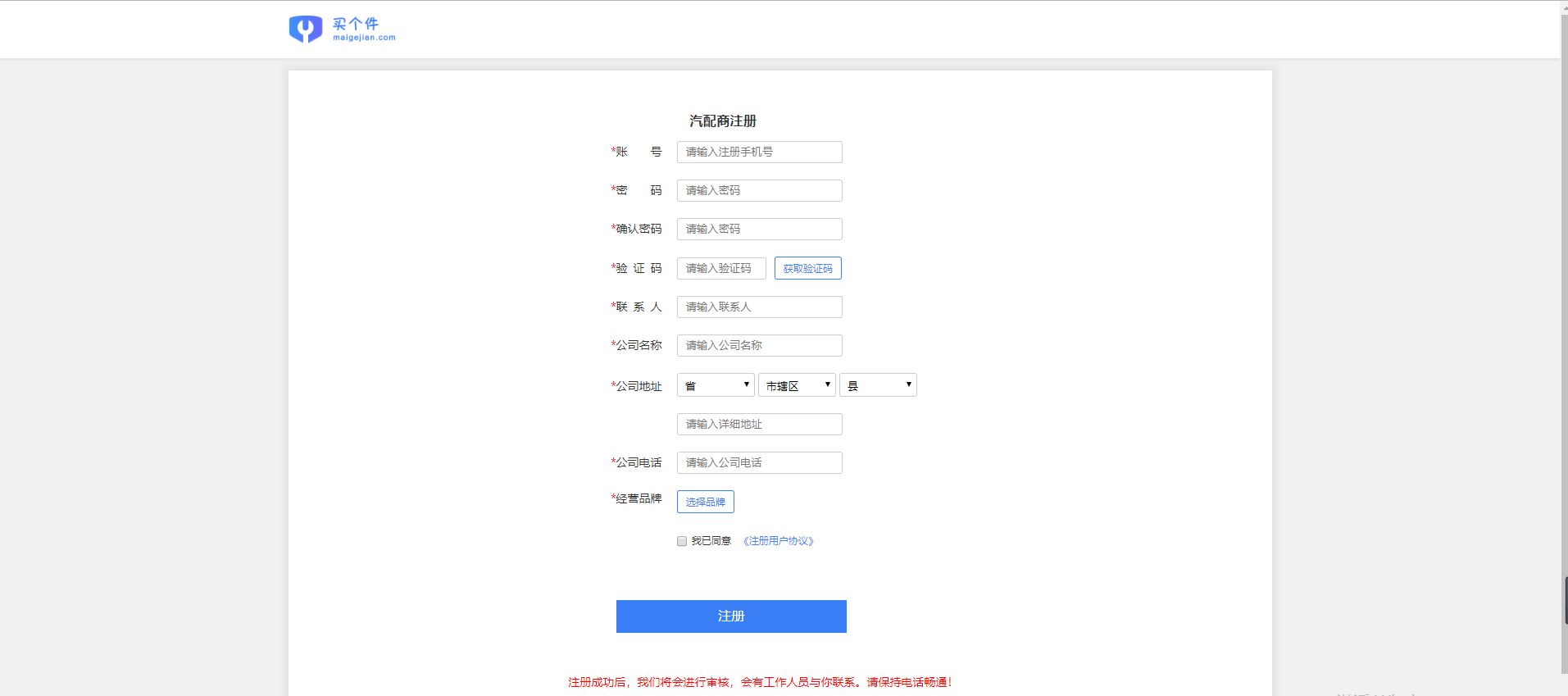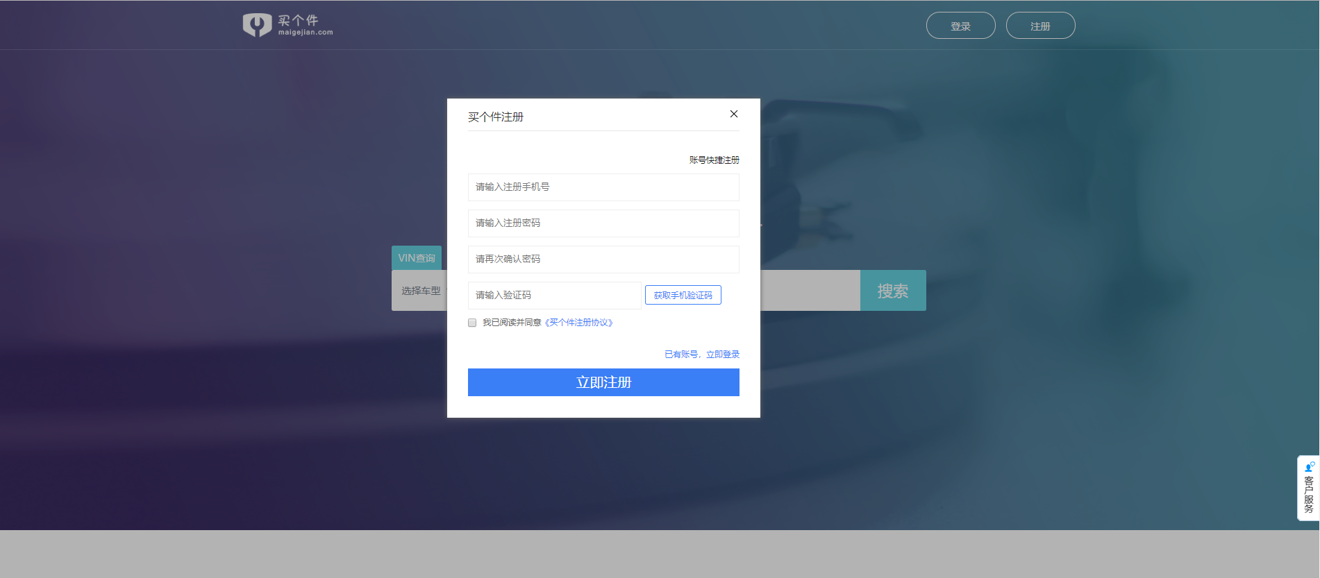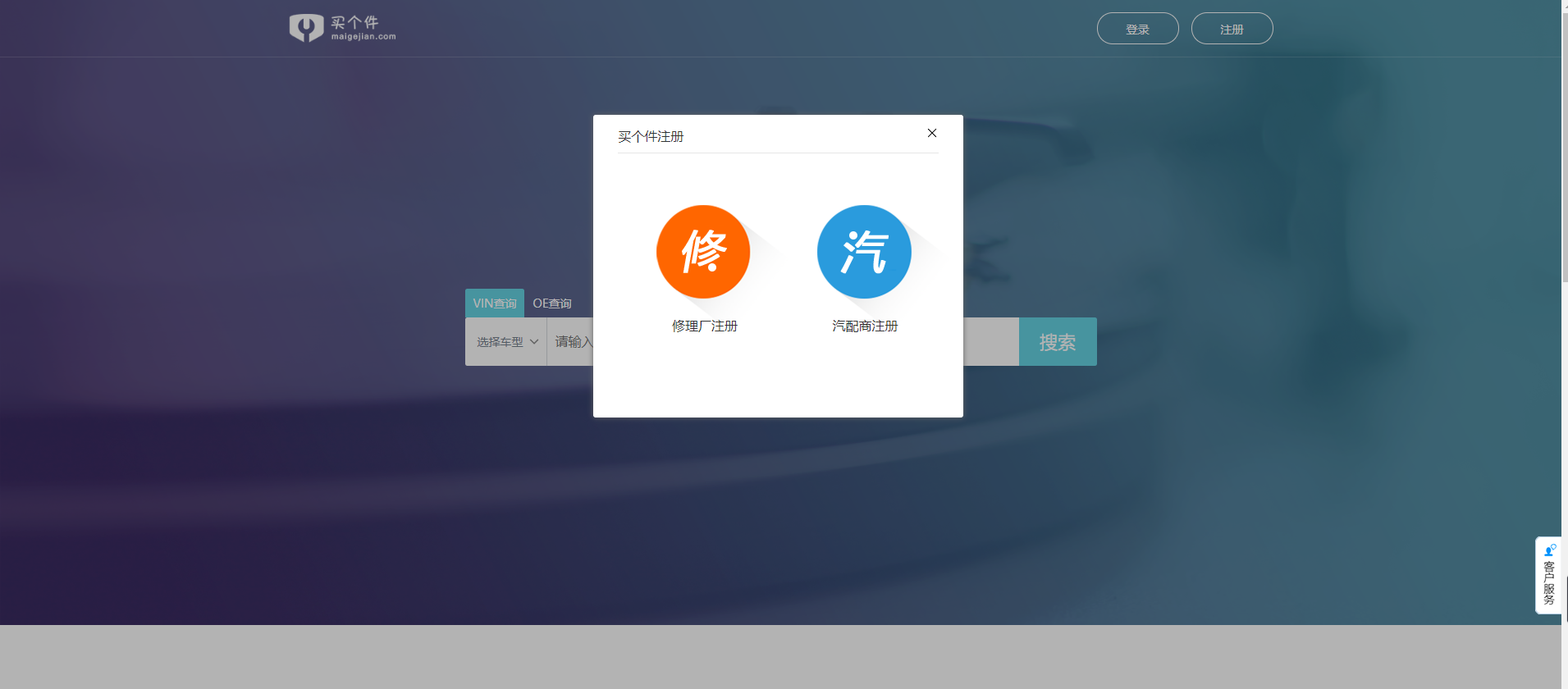 打开浏览器,在地址栏输入www.maigejian.com,或直接搜索“买个件”,进入到首页。点击右上角“注册”,若是修理厂使用则选择修理厂注册, 若是汽配商使用则选择汽配商注册。完善注册信息点击底部“注册”按钮即注册成功,如图所示: